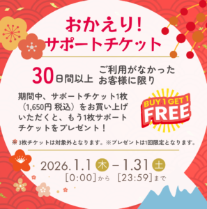 30日間以上、ジムのご利用がなかったお客様に限り、サポートチケット 1枚をご購入いただくと、なんともう1枚サポートチケットをプレゼント!