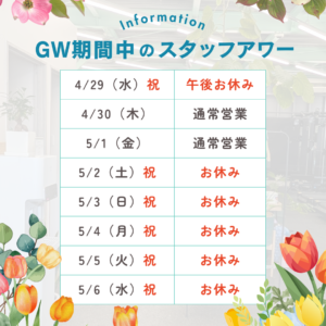 今年のGWは、5/2(土)~5/6(水)までお休みをいただきます。