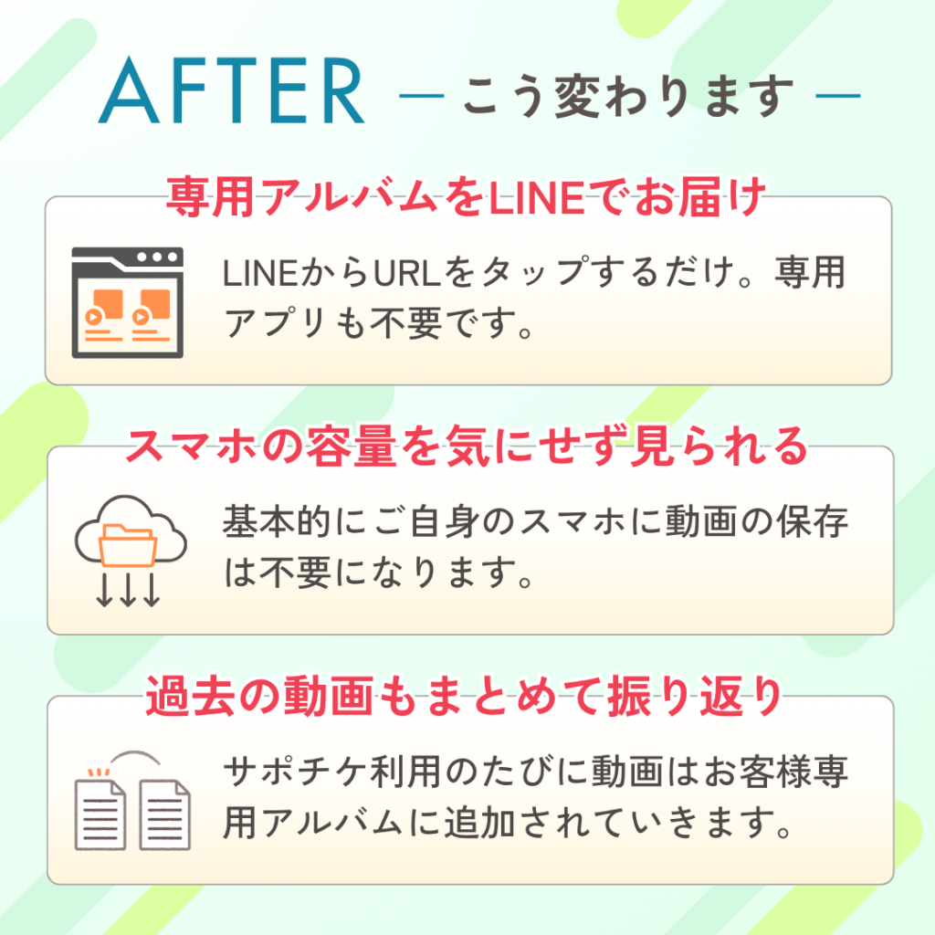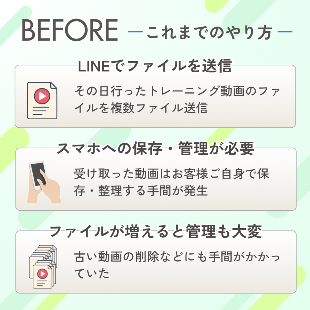 これまでトレーニング終了後に公式LINEから動画ファイルを個別にお送りしていましたが、今後はお客様専用の「動画アルバム」形式でお届けします。