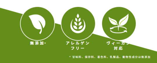 - 甘味料、保存料、着色料、乳製品、動物性成分は無添加