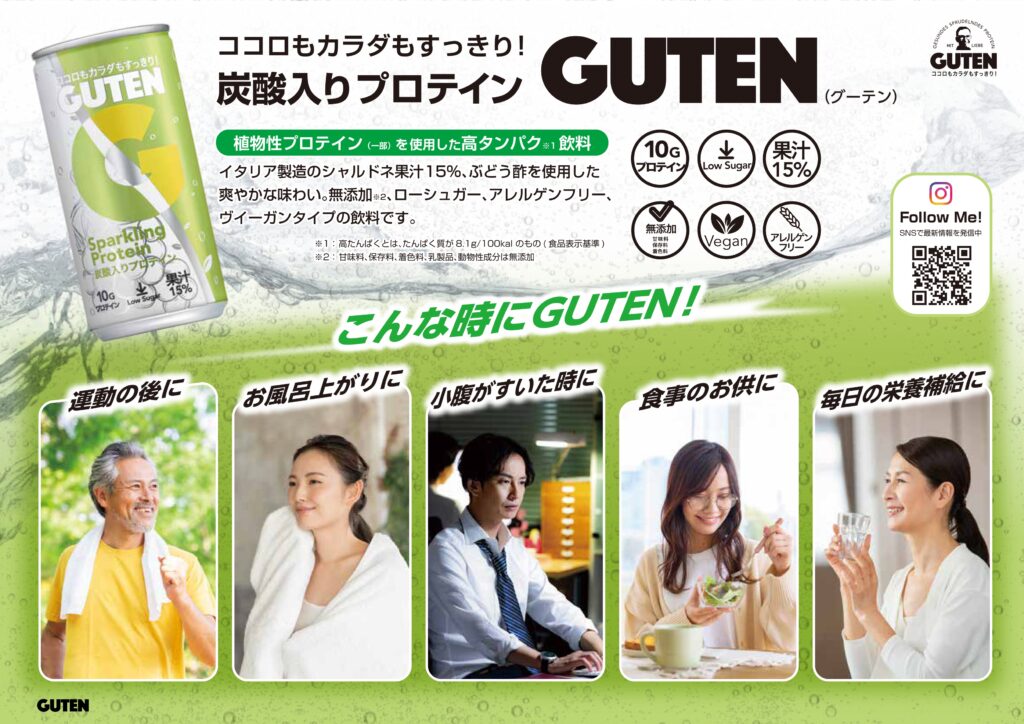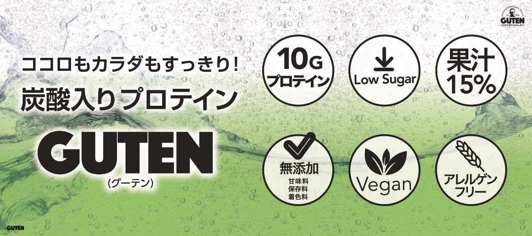 植物性プロテイン配合(一部)、甘味料・保存料・着色料・乳製品・動物性成分は無添加で厳選された成分を使用、ゴクゴク飲めるスッキリした味わいの果汁入り炭酸入りプロテインです。