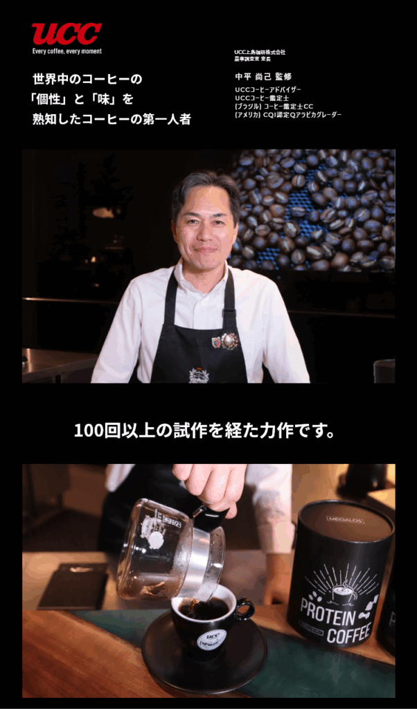 UCCとプロテイン入りコーヒーの共同開発に取り組み、コーヒー本来の味のクオリティーを保ちながらプロテインの品質を確保し、 ついに商品化に成功しました。